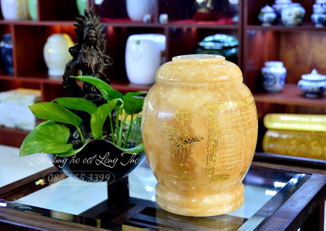Hũ đựng tro cốt đá Pakistan vàng là một tác phẩm tâm linh được chế tác từ đá tự nhiên cao cấp, mang ý nghĩa tôn kính sâu sắc đối với người đã khuất. Với thiết kế thanh nhã và chất liệu bền bỉ, hũ không chỉ là nơi lưu giữ tro cốt mà còn là biểu tượng của lòng thành kính mà người sống gửi gắm đến người ra đi. Đây là lựa chọn lý tưởng cho những gia đình mong muốn tạo nên một nơi an nghỉ thanh tịnh và đầy ý nghĩa cho người đã mất.