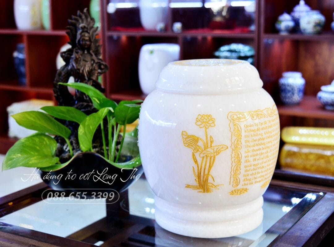 Trong văn hóa tang lễ, việc lưu giữ tro cốt của người đã khuất là một nghi thức quan trọng, thể hiện lòng thành kính và tưởng nhớ của người thân. Hũ đựng tro cốt bạch ngọc, với vẻ đẹp tinh tế và ý nghĩa tâm linh sâu sắc, là một lựa chọn trang trọng và ý nghĩa. Sản phẩm được chế tác từ đá tự nhiên, mang vẻ đẹp thuần khiết và bền vững theo thời gian. Không chỉ là vật phẩm lưu giữ tro cốt, hũ bạch ngọc còn là biểu tượng của sự an yên, vĩnh hằng và là cầu nối tâm linh giữa người đã khuất và người ở lại.