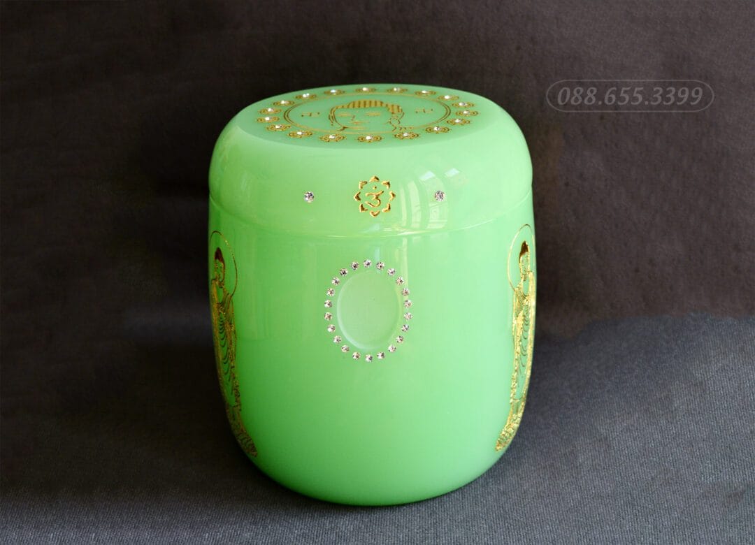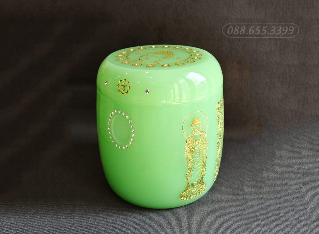 Hũ đựng tro cốt được chạm khắc hình Phật với ánh vàng làm nổi bật sự sang trọng, bắt mắt, tượng trưng cho việc giác ngộ và chở che, giúp bảo vệ linh hồn, giúp xua đuổi tà khí và mang lại sự thanh thản cho người mất, đưa họ về cõi an lành. Hũ ngọc lưu ly xanh kiểu bí đao là một lời cầu chúc cho người đã khuất sớm siêu thoát, không vướng bận với lo toan thế tục nơi cõi trần, đem lại một giá trị tín ngưỡng đầy ý nghĩa và sâu sắc.