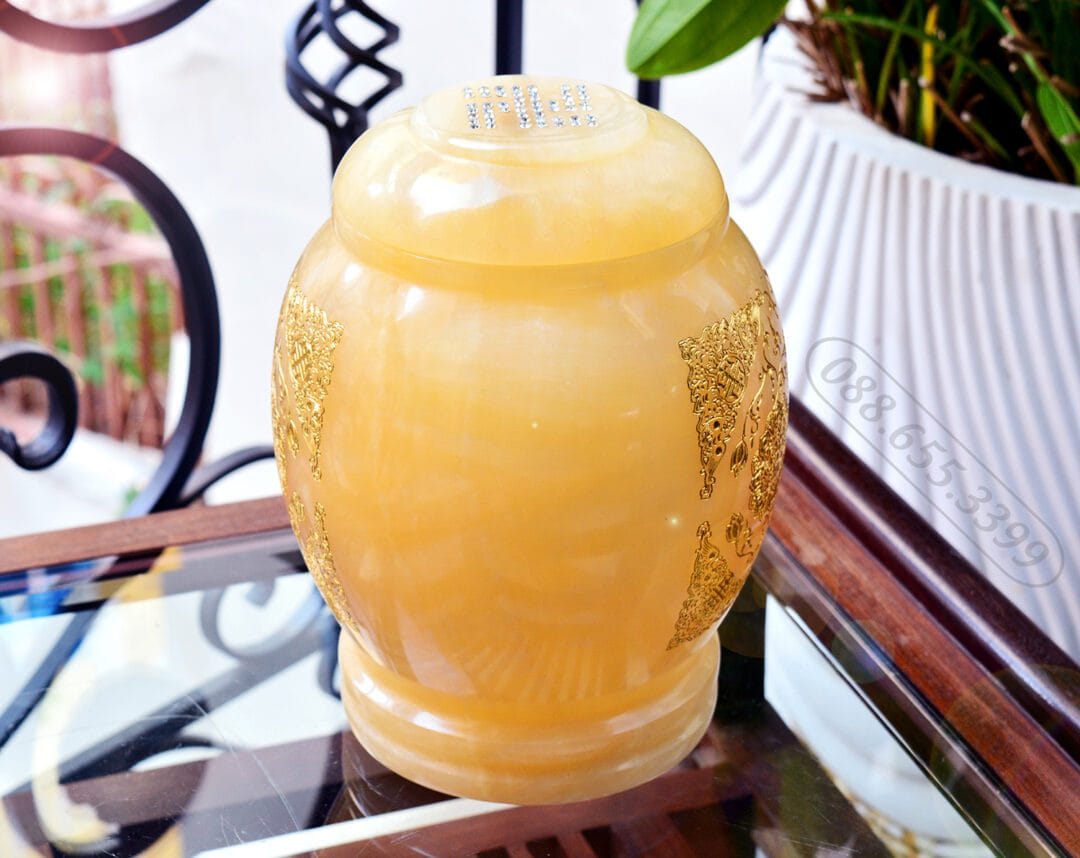 Hũ đựng tro cốt không chỉ là nơi lưu giữ di cốt mà còn là sự kính trọng và tri ân sâu sắc từ những người ở lại. Hũ Ngọc Hoàng Long được chế tác thủ công với kinh văn được chạm khắc tinh xảo tôn lên vẻ đẹp trang nghiêm, bền vững, đồng thời mang ý nghĩa tâm linh sâu sắc, giúp dẫn dắt linh hồn người đã khuất đến cõi bình an, thoát khỏi mọi đau buồn nơi trần thế.